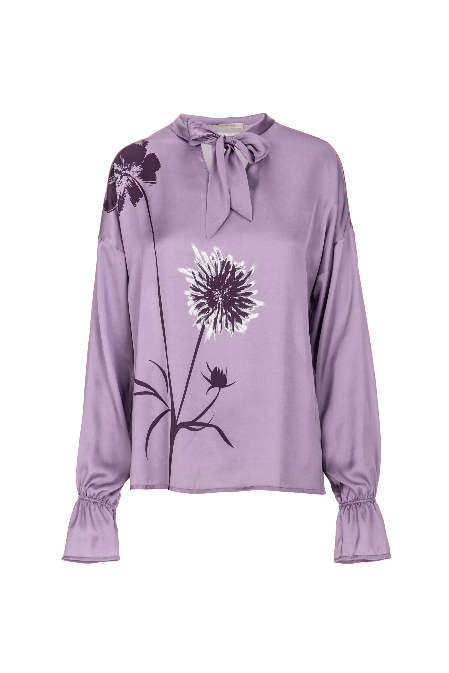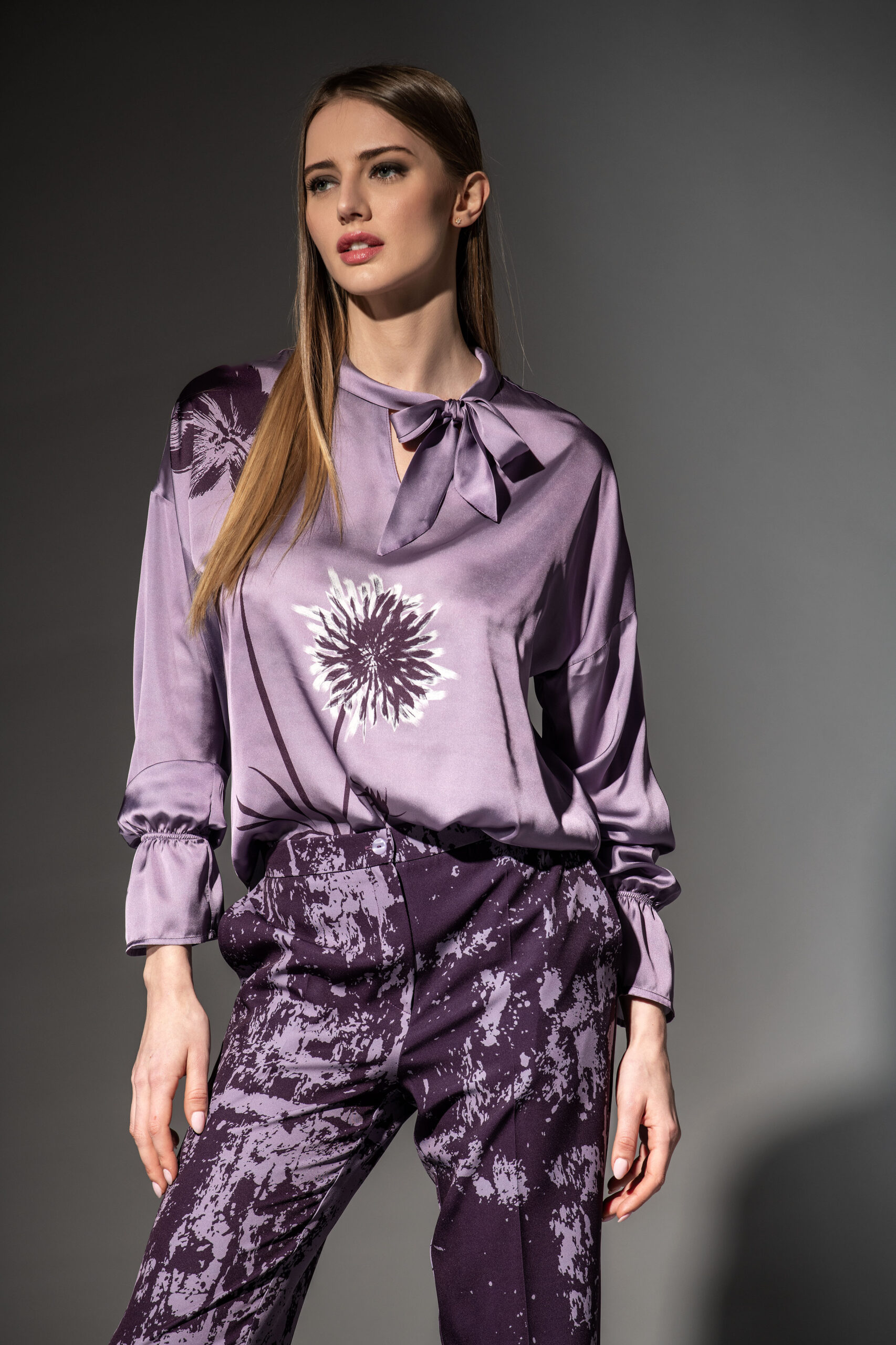Blusa floral con cuello de lazo, mangas elásticas y aberturas laterales.