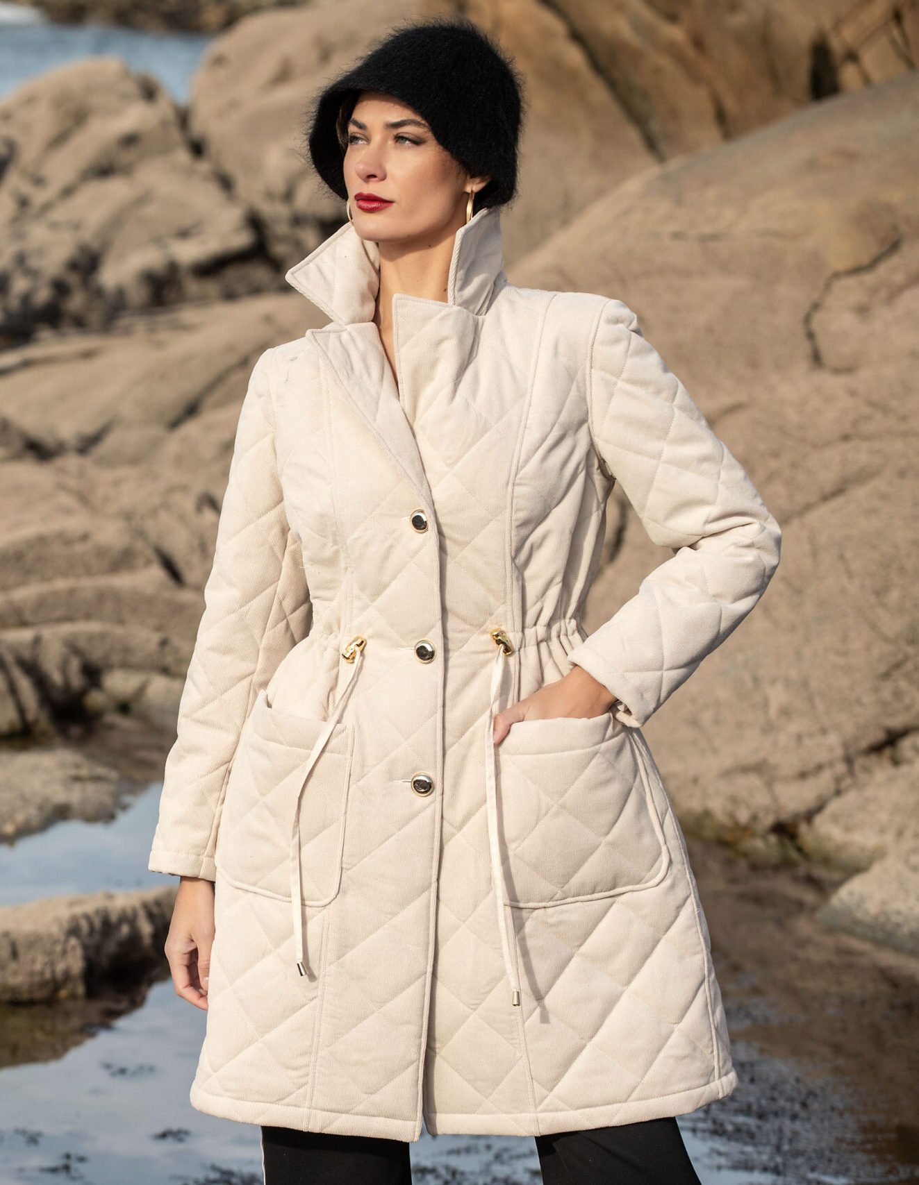 Chaqueta de pana acolchada con cuello vuelto y cinturón incorporado.