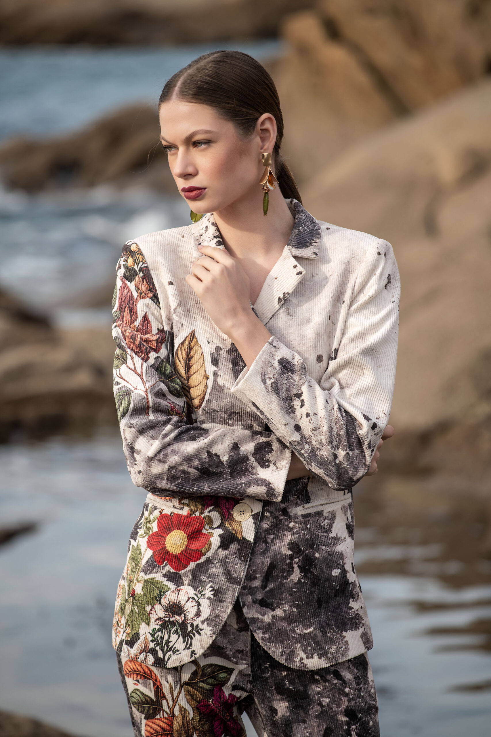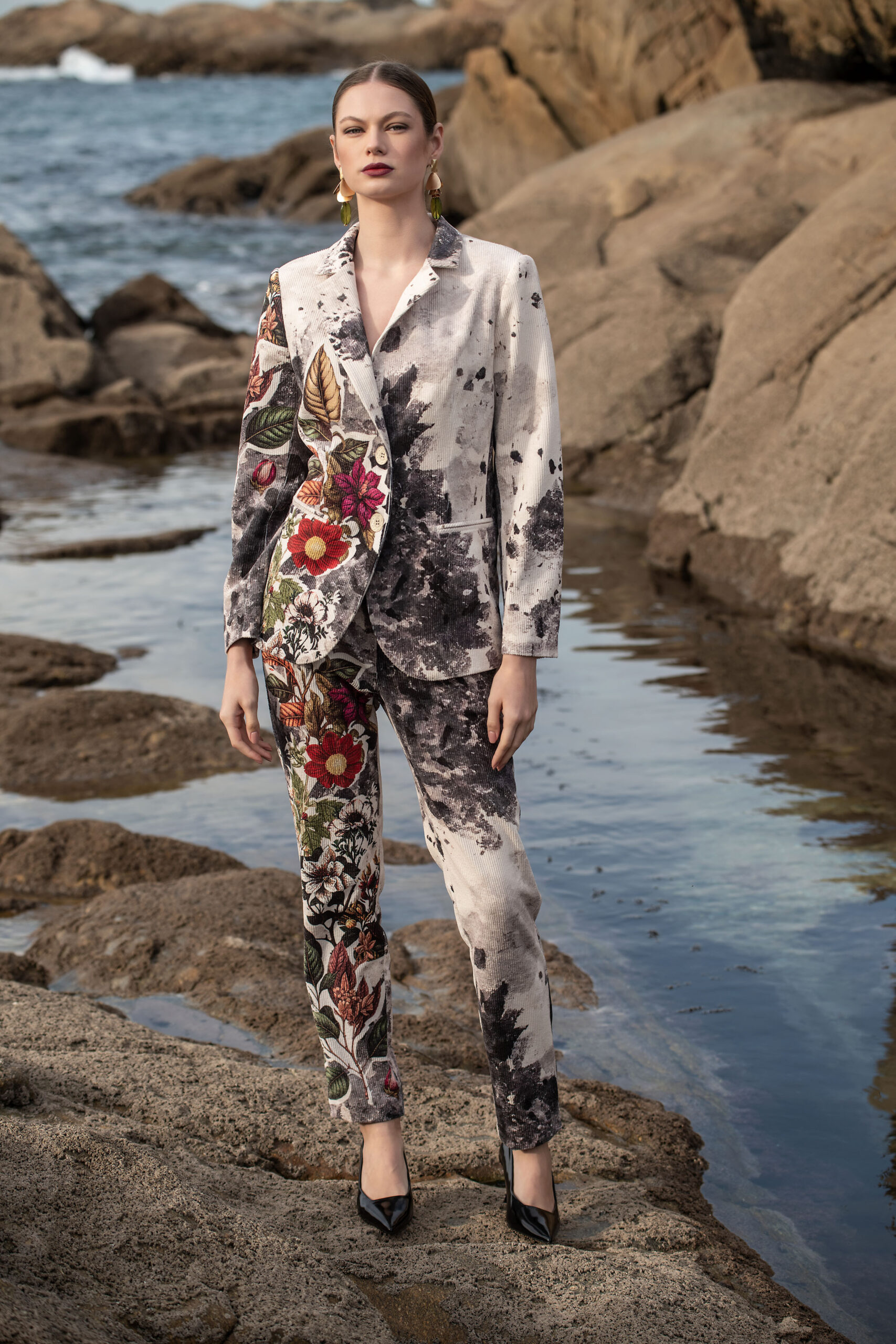 Blazer estampado em bombazine, com forro.