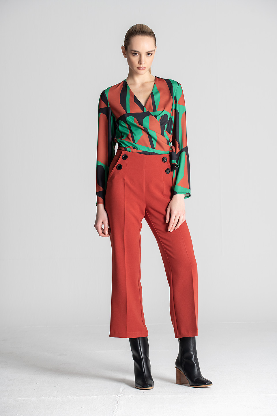 Calça de cintura subida, com bolsos laterais e botões decorativos.