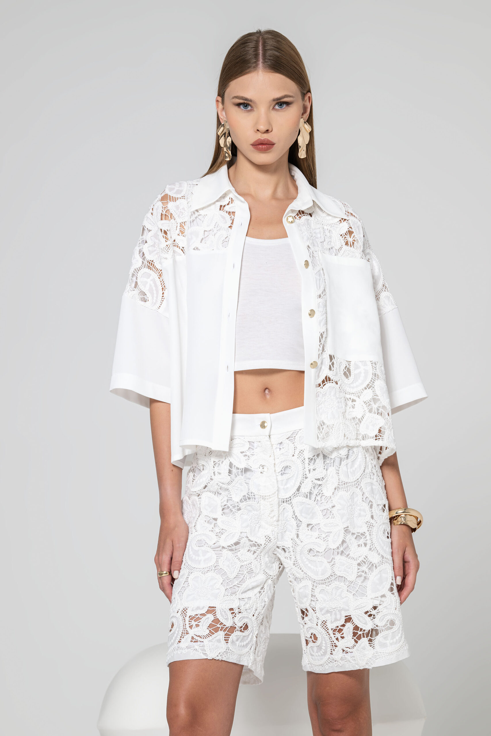Camisa ampla com aplicações em renda.