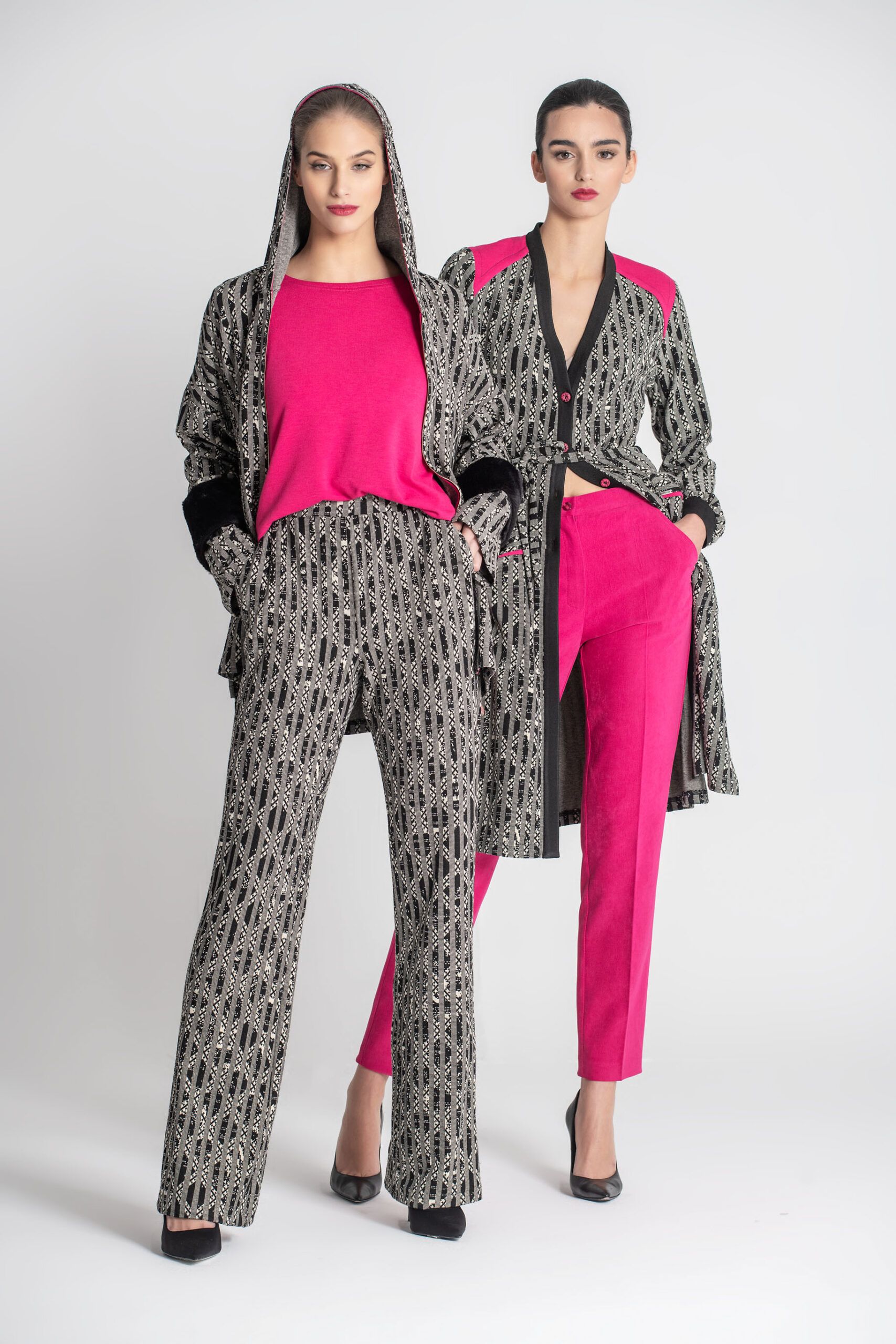 Casaco de malha jersey, com malha combinada nos ombros a rosa e cinto de laçada.