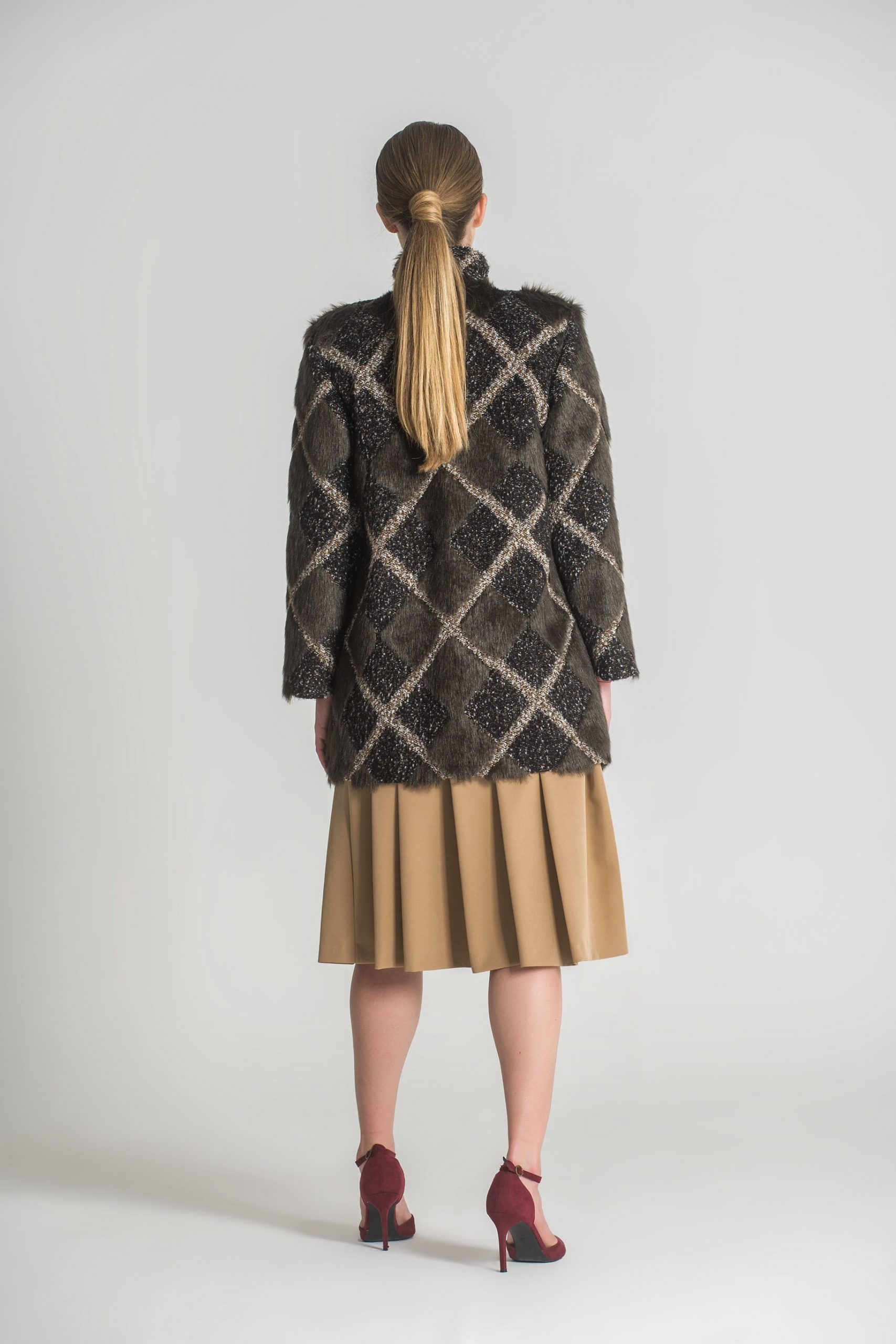 Casaco 7/8, forrado, em tecido misto de tweed e pelo.