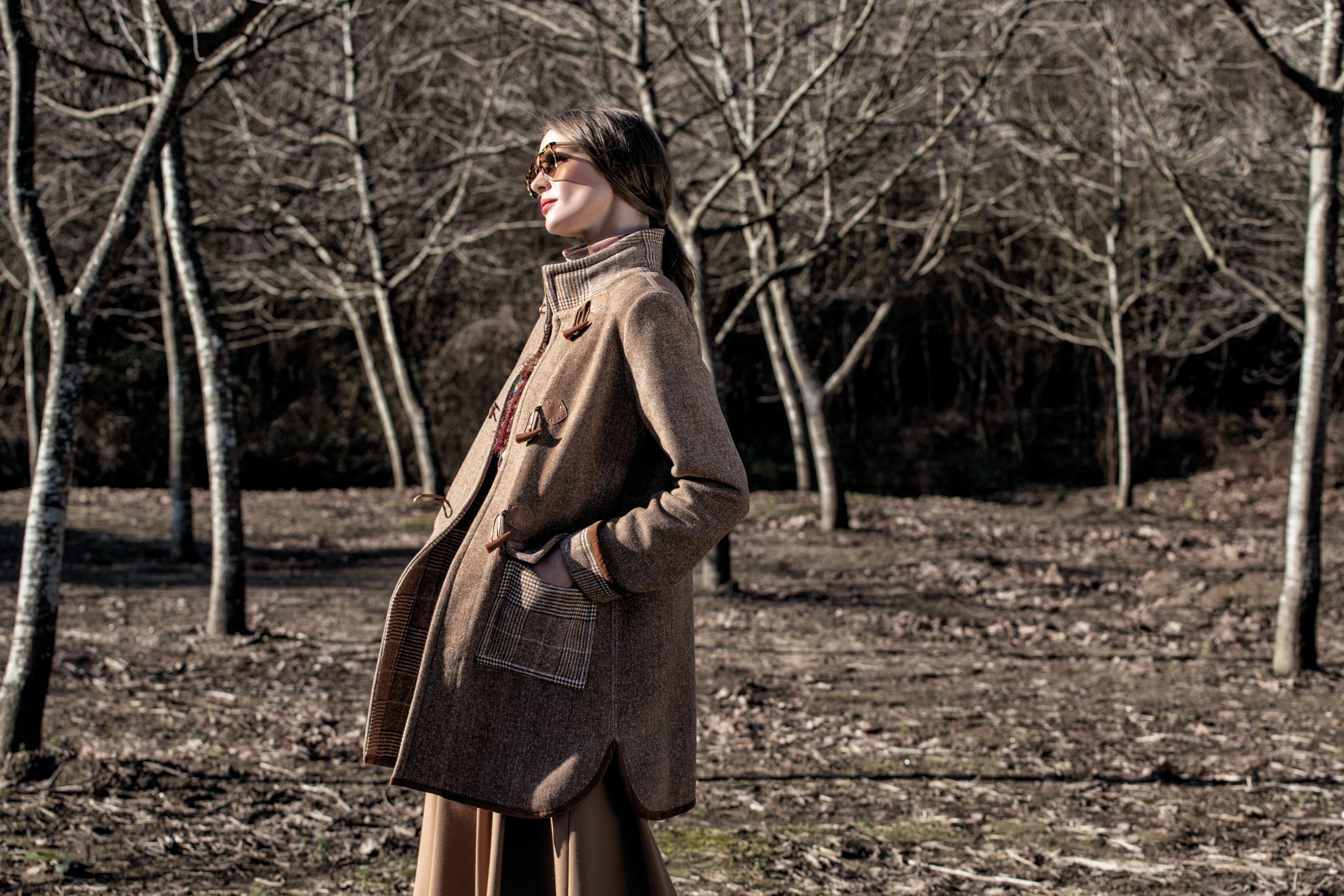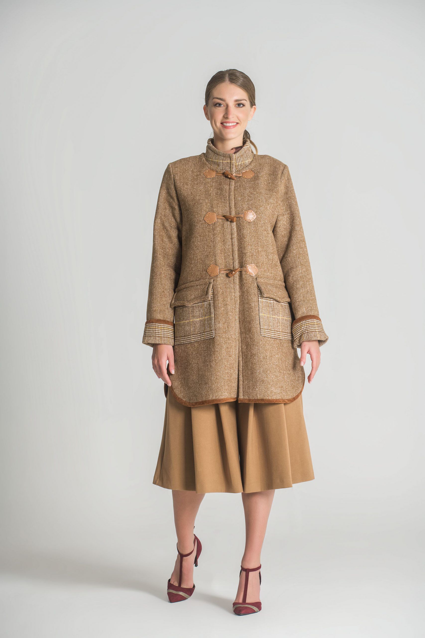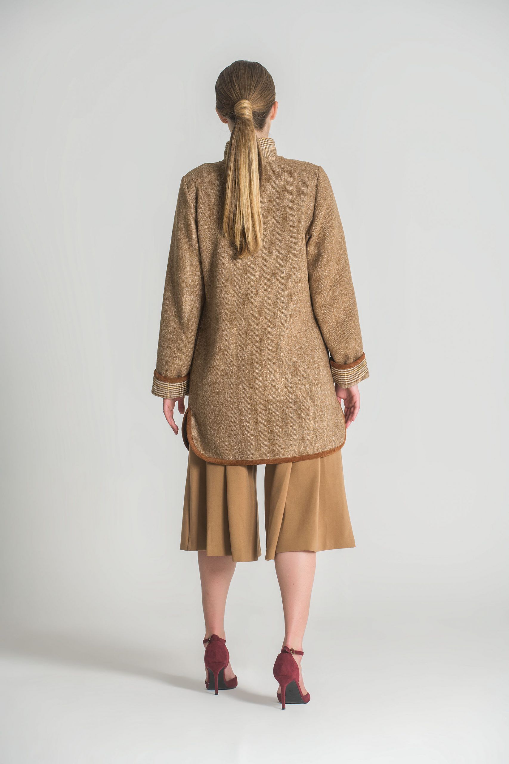 Casaco 7/8, com padrão espinhado, aperta com alamares, bolsos de chapa com paleta e avivado a camel.