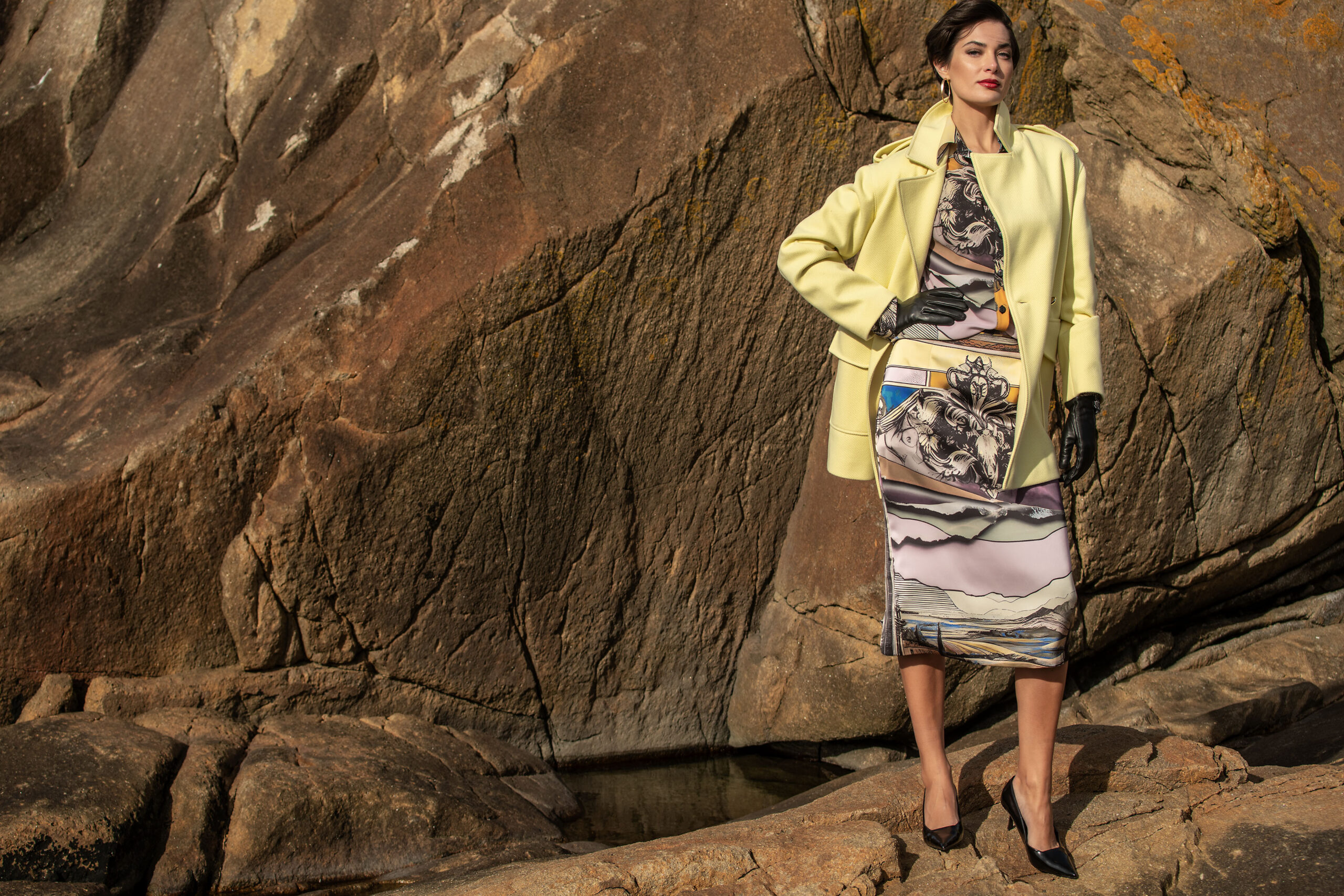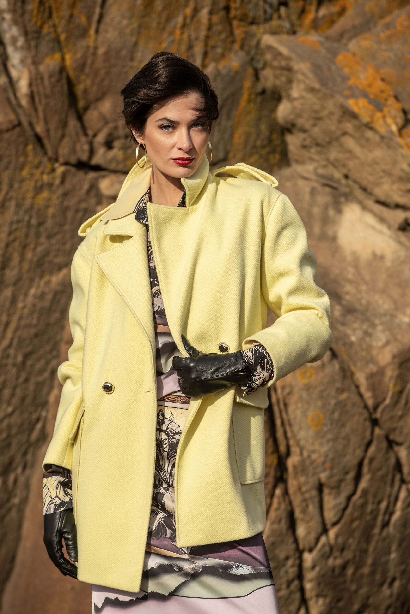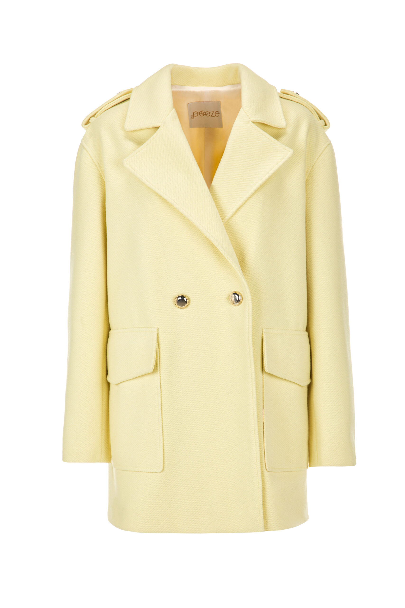 Casaco cruzado, com bolsos de chapa, gola de virados e platinas nos ombros.