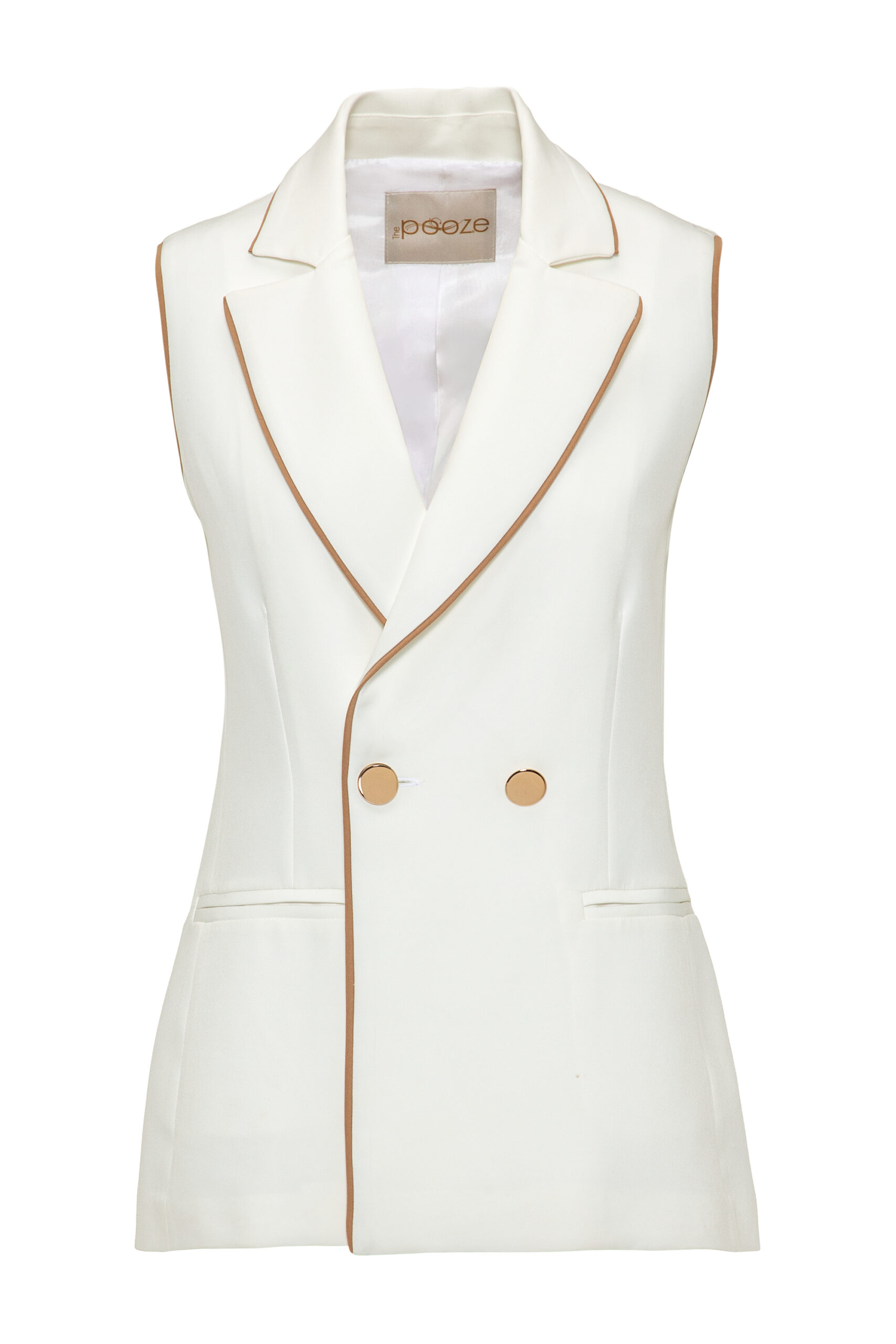 Colete forrado, com trespasse, com bolsos e avivado a beje.