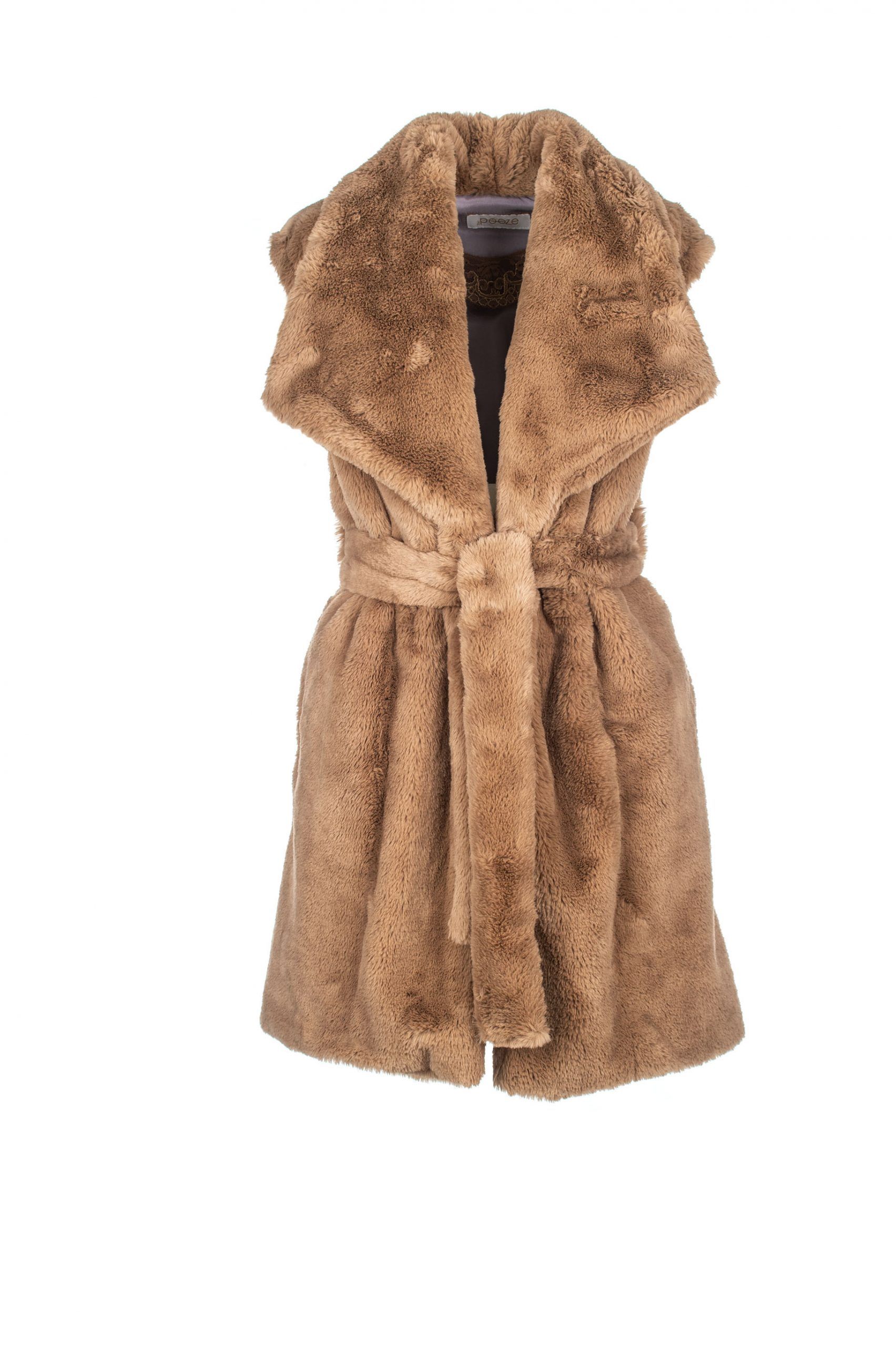 Colete de pelo, forrado, com cinto e bolsos laterais.