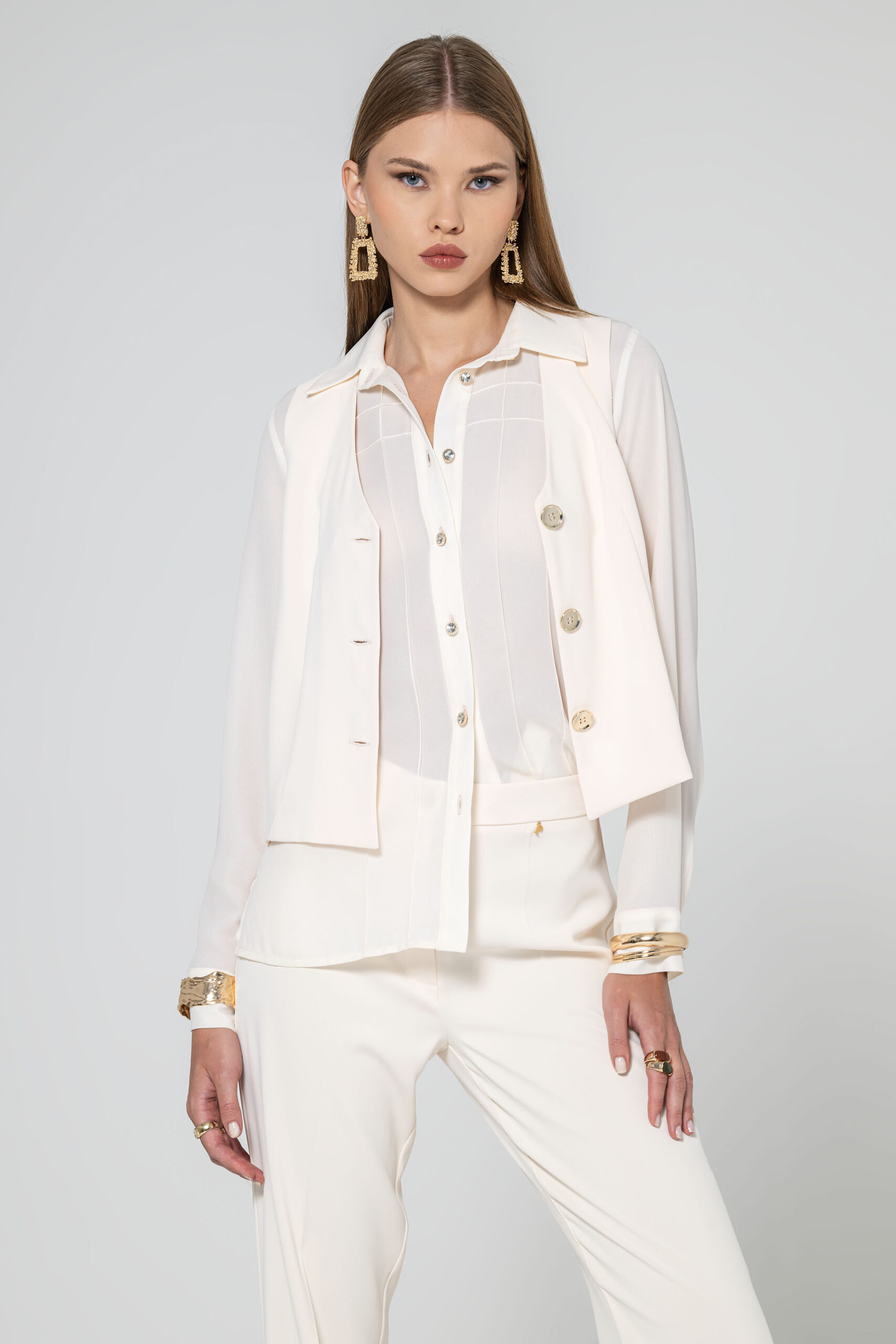Colete forrado, com abotoadura frontal a botões dourados.
