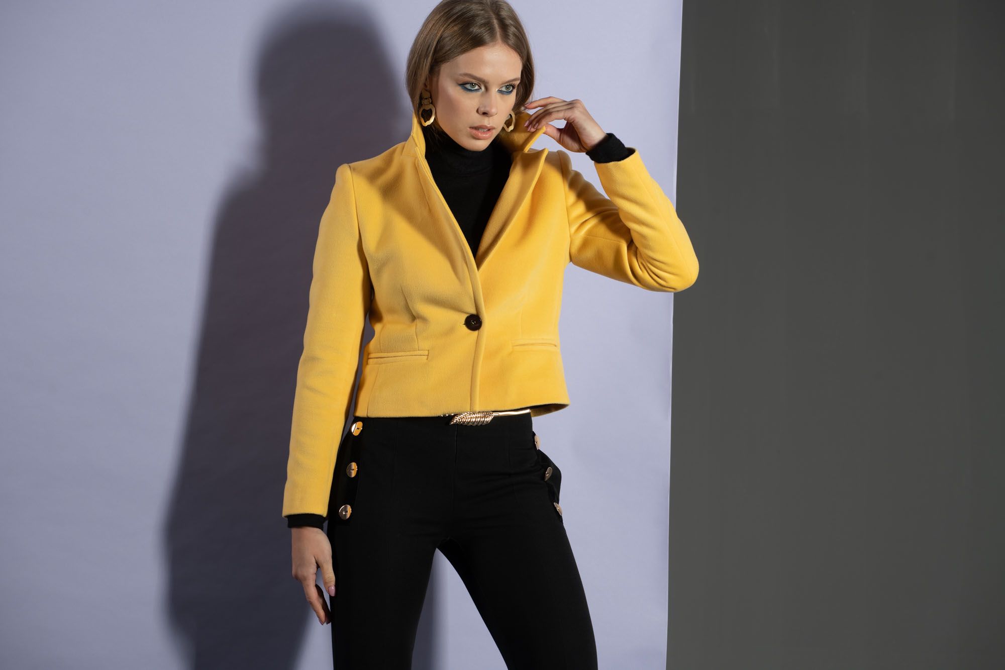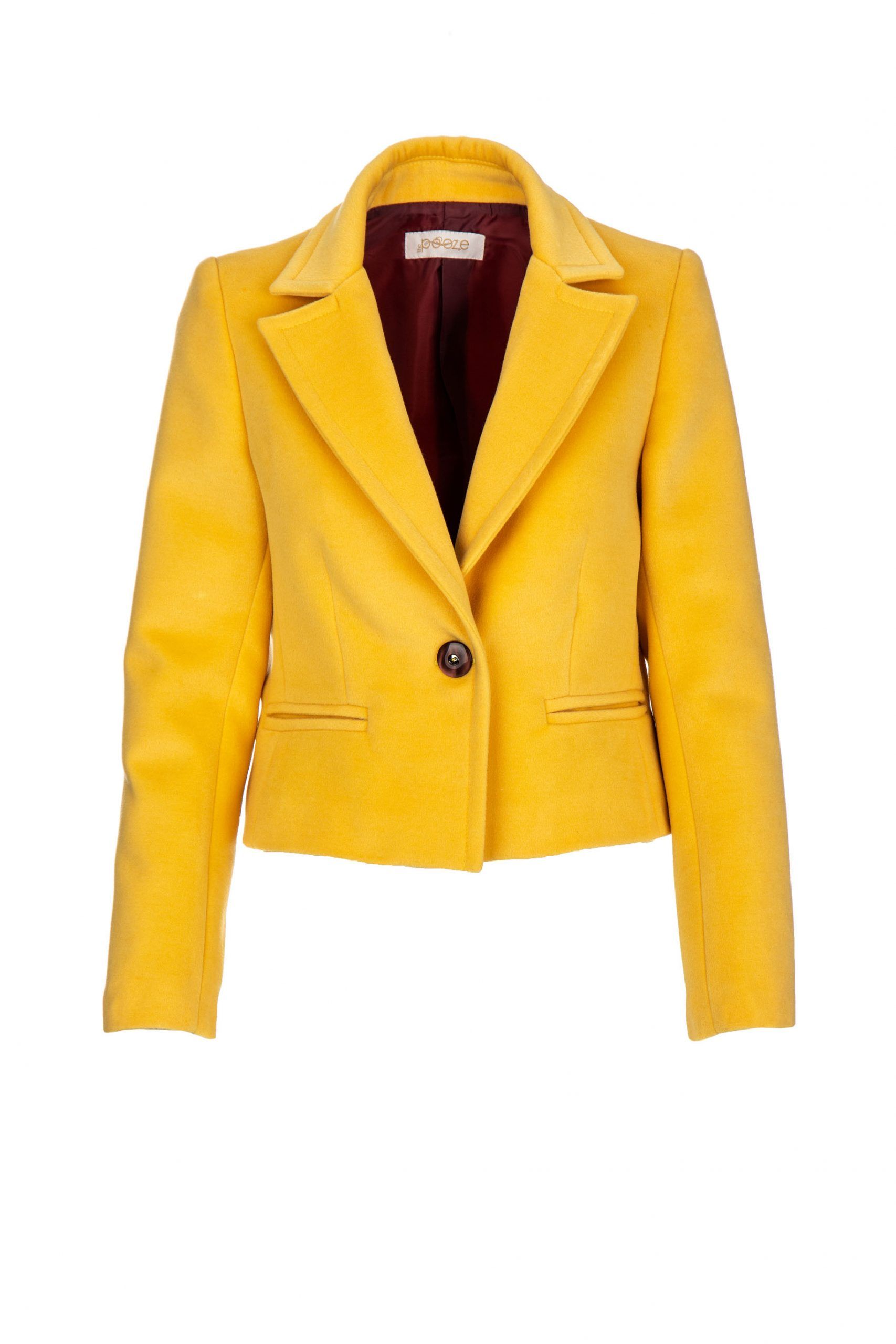 Jaqueta curta com gola de virados e forro a contraste.