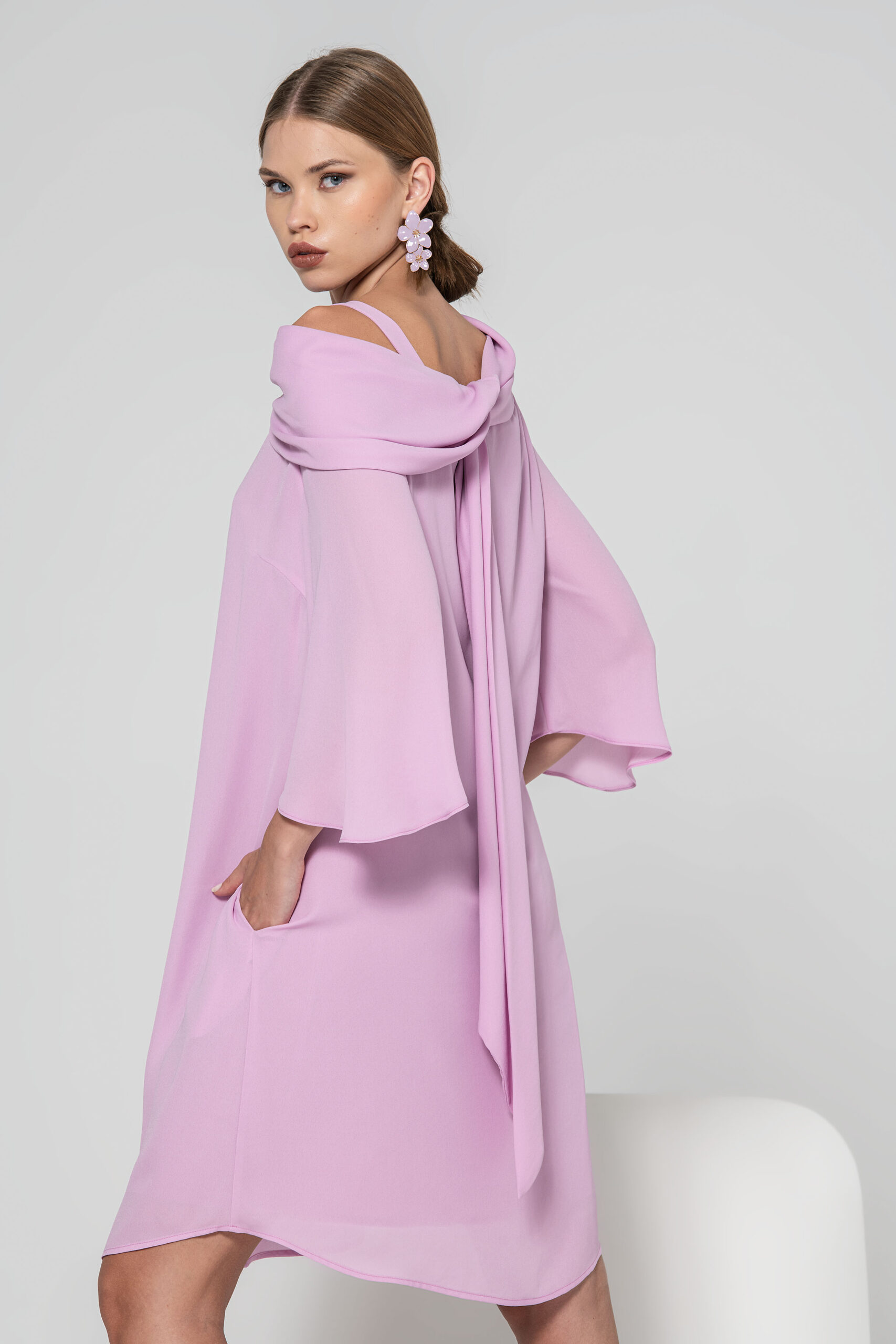 Vestido midi fluido em tom rosa suave.