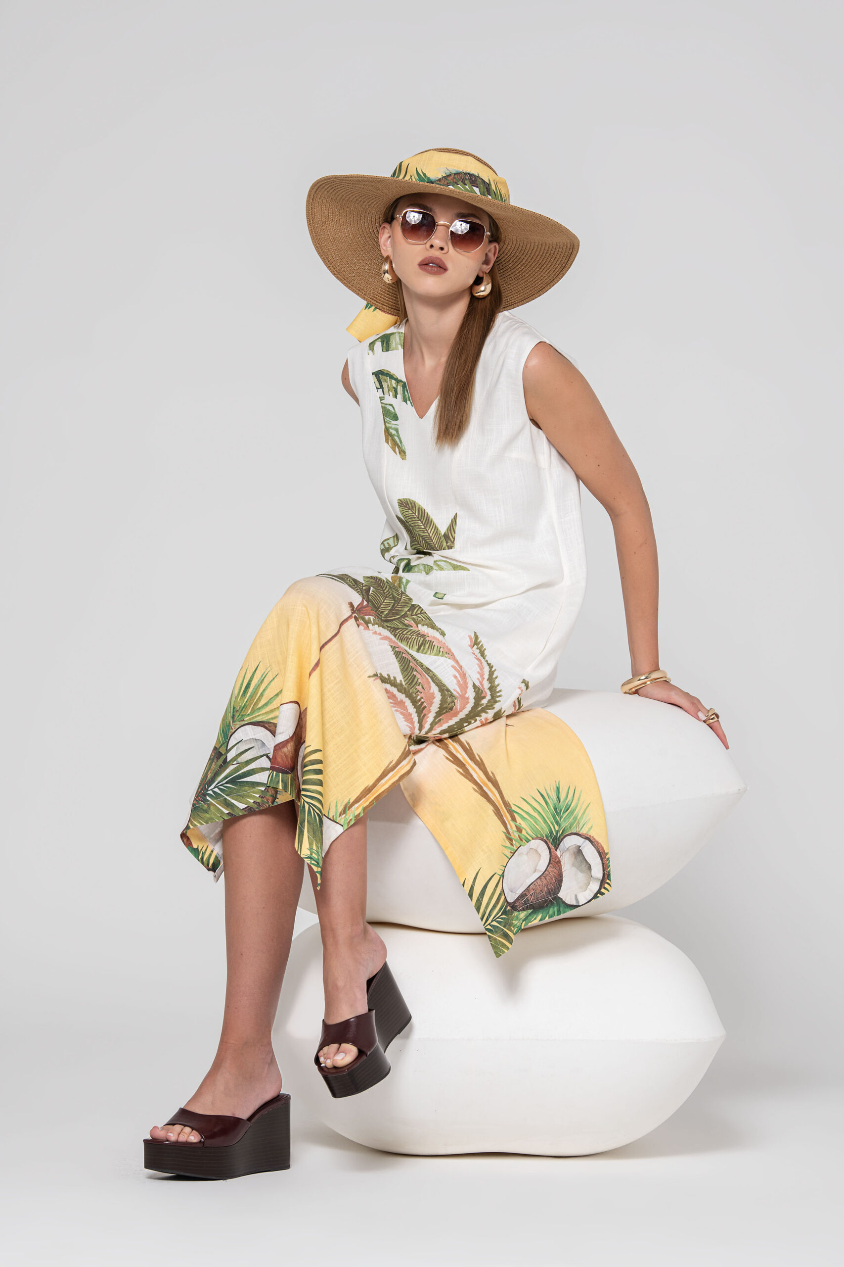 Vestido com estampagem tropical, com decote em bico e abertura lateral.
